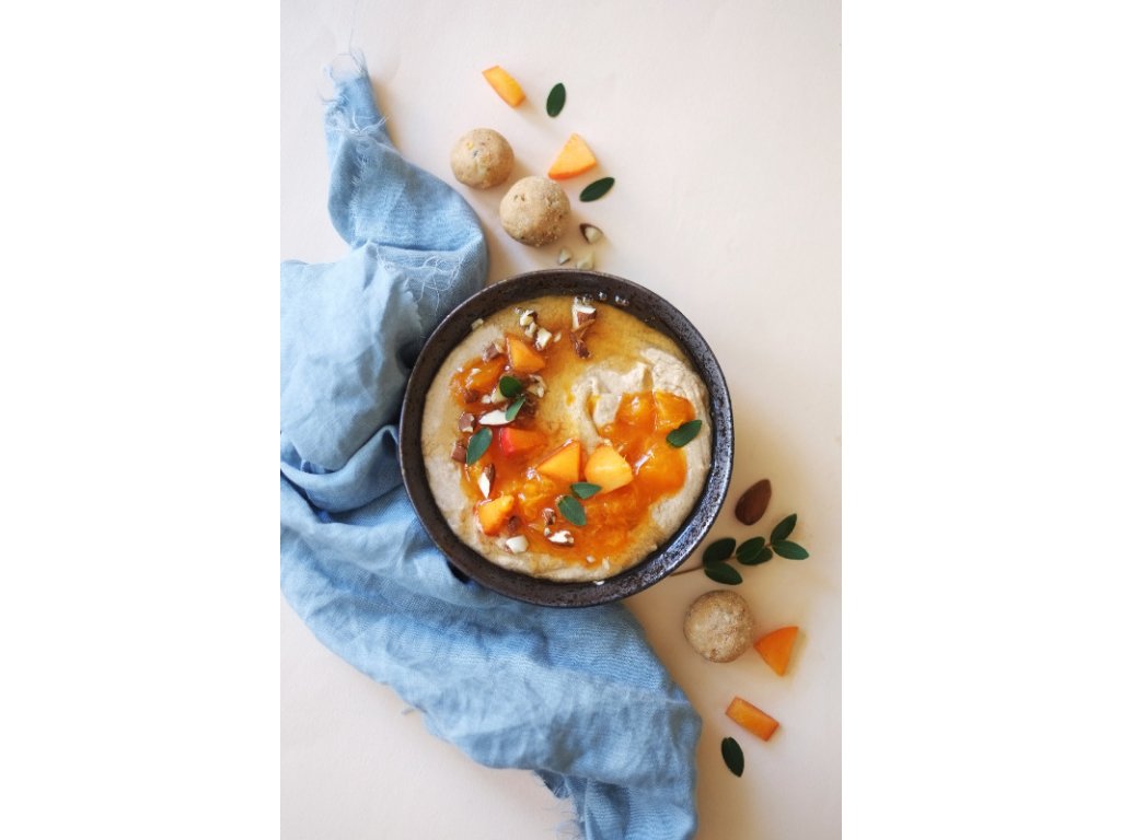 Složení: celozornný ječemen z ekologického zemědělství v ČR 55 %, sušené meruňky 15 %, mandle plátky 14%, konopné semínko, lyofilizovaná meruňka, třtinový cukr