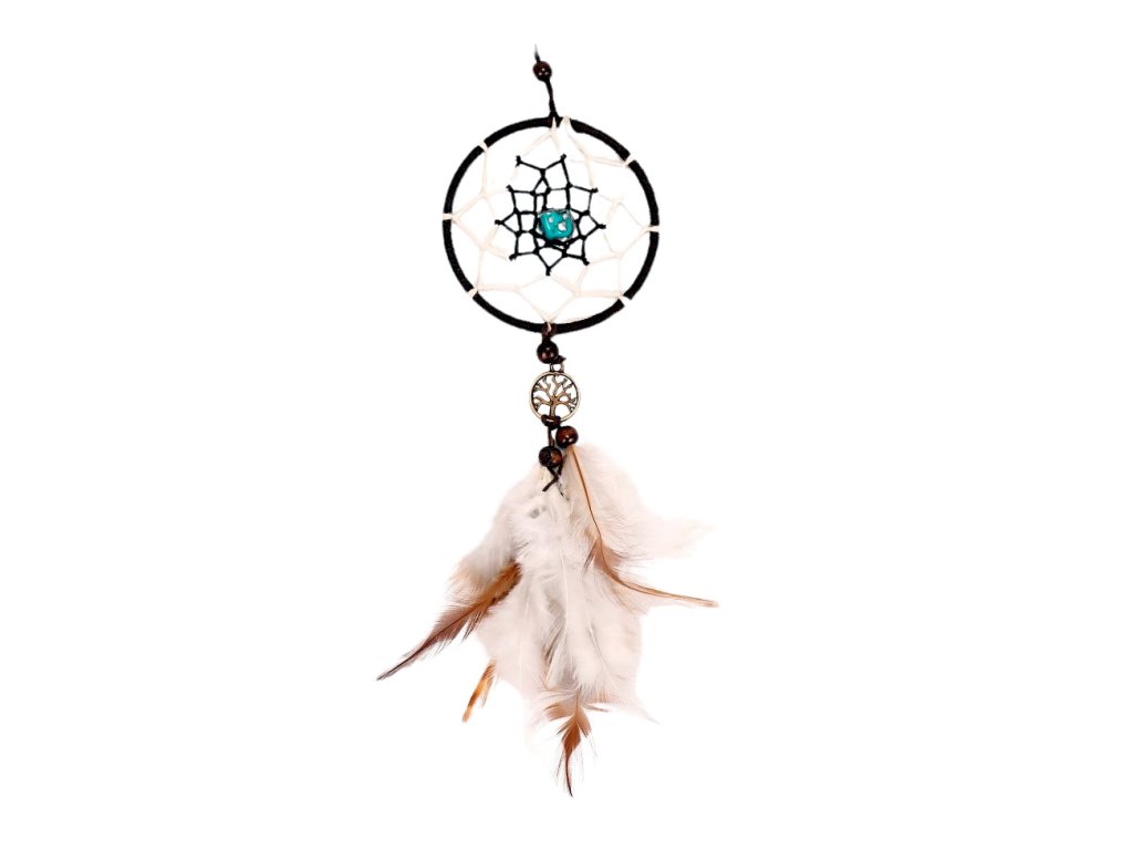 Łapacz snów brązowo-biały z metalowymi zawieszkami